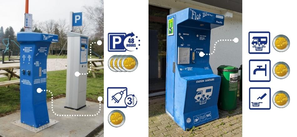 - Services : 2 € = 3 heures d'électricité OU vidange des eaux noires et approvisionnement d'eau. Payez les services directement à la borne automatique et suivez les instructions.