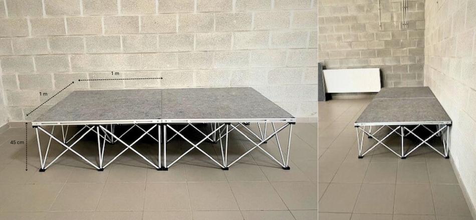 - Podiums (max. 18 m2, sur demande) : 1 m x 1 m - Hauteur fixe : 45 cm - Marche pied : 1 m x 25 cm x 25 cm